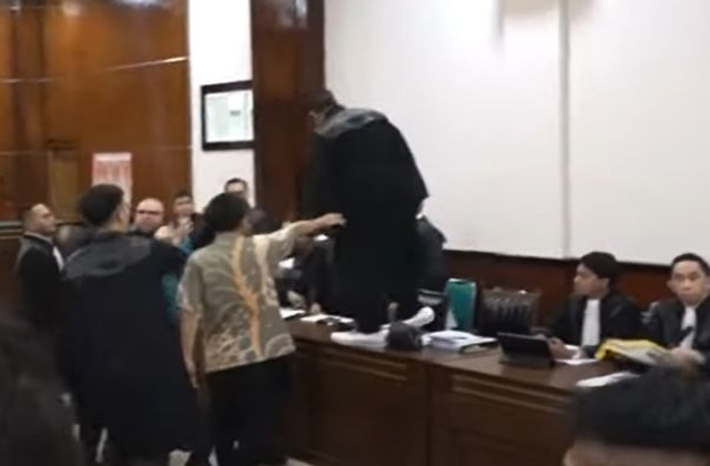 Saat kericuhan berlangsung, salah satu pengacara Razman tertangkap kamera berdiri di atas meja sidang.