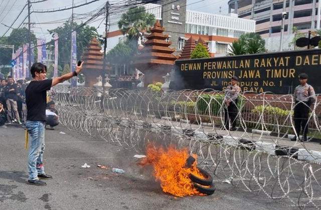 Mereka juga melakukan aksi bakar ban di depan DPRD Jatim sambil membacakan puisi yang berjudul ‘Taek’. Massa yang terdiri dari ratusan mahasiswa kompak menggunakan pakaian serba hitam.