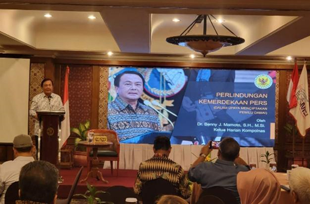 Benny Josua Mamoto yang juga Ketua Dewan Pertimbangan SMSI hadir bersama salah satu wakilnya di SMSI, Mayor Jenderal TNI (Purn) Herwin Suparjo, dan Anggota Dewan Pers Tri Agung Kristianto.