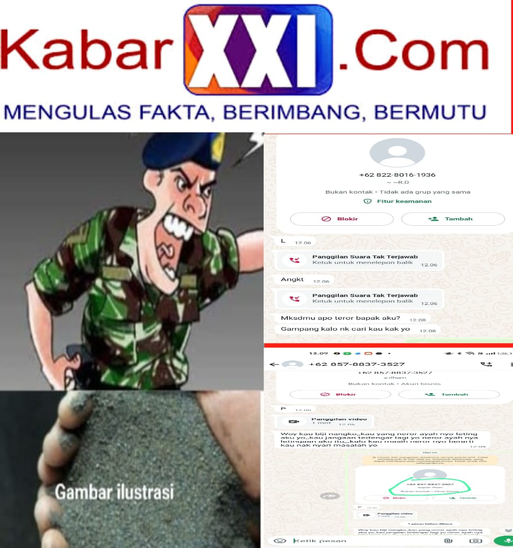 Tidak terima dengan adanya konfirmasi yang di lakukan oleh wartawan kepada bapaknya (Aji Mulyadi) sehingga oknum tentara merasa terganggu dan mengancam Akan mencari dan datang ke pulau Bangka untuk mencari yang di anggap telah meneror Bapak nya (aji Mulyadi) salah satu Kolektor timah di berok, kecamatan koba, kabupaten Bangka Tengah, patut diduga kebal hukum
