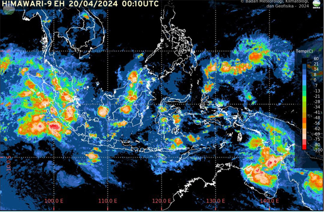 Sementara itu, Kepala Pusat Meteorologi Publik, Andri Ramdhani mengatakan, sepekan ke depan terhitung mulai tanggal 20 April 2024, sejumlah wilayah Indonesia masih berpotensi diguyur hujan dengan intensitas sedang hingga lebat meliputi sebagian besar Sumatera bagian Utara dan Barat, sebagian besar Jawa, Nusa Tenggara, Kalimantan bagian Barat dan Tengah, Sulawesi bagian Selatan dan Tenggara, Maluku dan Papua.
