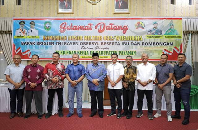 PASAMAN, KabarXXI.Com – Bupati Pasaman, H. Benny Utama didampingi Sekretaris Daerah (Sekda) Maraoundak beserta Ketua TP PKK Ny Susi Benny Utama, OPD dan Forkominda Pasaman menyambut hangat kedatangan Danrem 032/Wrb Brigjen TNI Rayen Obersyl beserta Isteri dan rombongan di Rumah Dinas Bupati Pasaman, Jumat, sore, 16 Juni 2023.