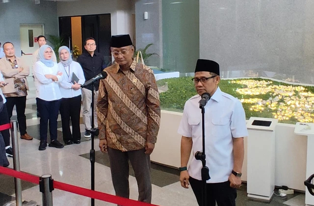 Menteri PU Dody Hanggodo bersama Menko Bidang Pemberdayaan Masyarakat Muhaimin Iskandar, di Kantor Kementerian PU, Jakarta Selatan, Selasa, 07 Oktober 2025.