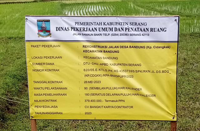 Sumber dana DTU – DAU – Kab Serang masa pemeliharaan 180 hari kalender paket pekerjaan rekontruksi jalan Kp. Cidangkak, Desa Bandung, Kecamatan Bandung, Kabupaten Serang.