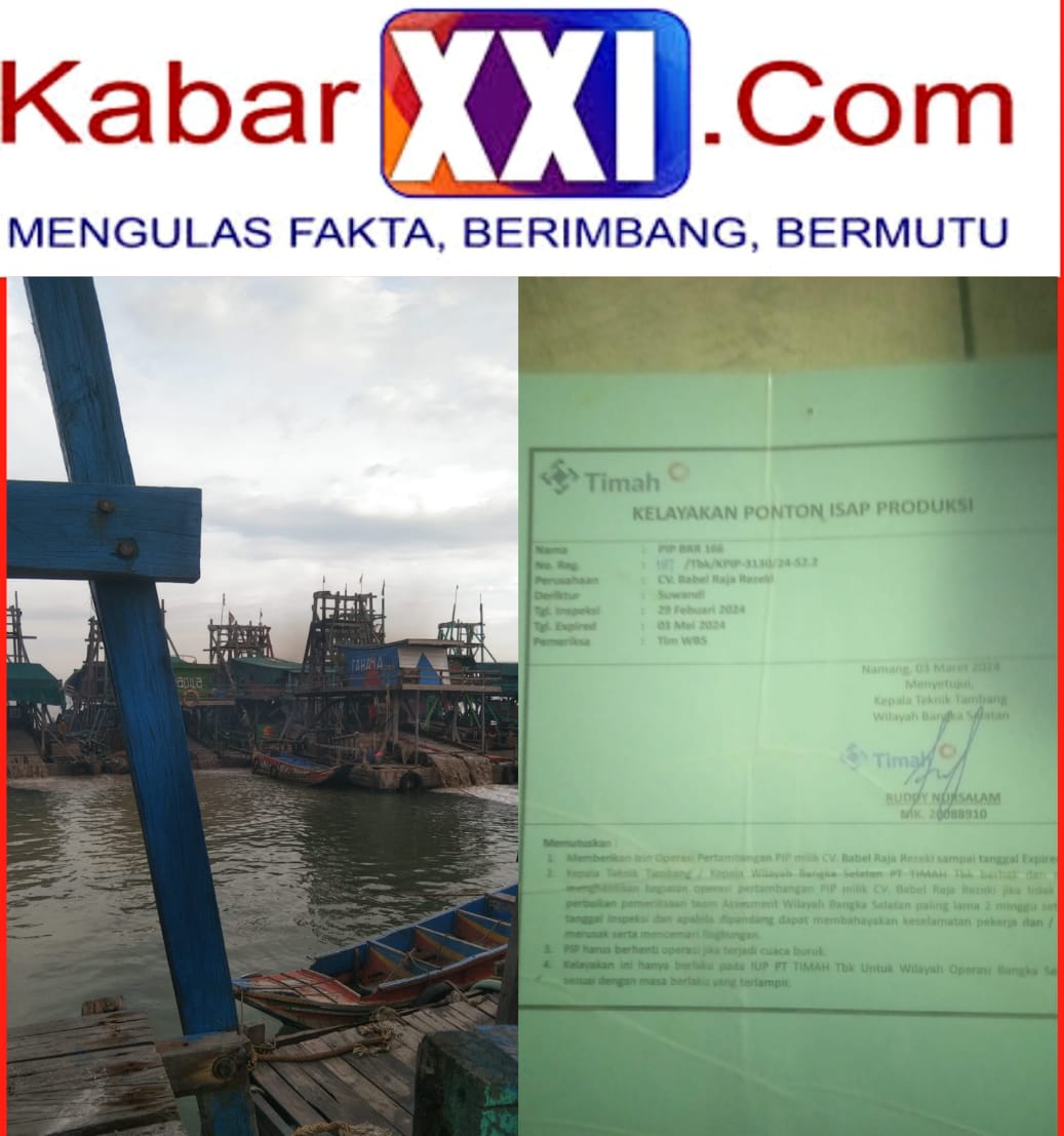 Saat rekan media menghubungi Kepala Pengawas Operasional Ponton Isap Produksi CV BRR Pak Edy melalui Via WhatsApp Minggu 10/03/24 lalu, “iya benar pak kami di berikan kuota ponton lebih dari 10 unit ponton, Yang menjadi pegangan saya hanya SILO atau surat layak operasi dengan jangka waktu tertulis tgl inspeksi 29 Januari 2024 dan tanggal expired 03 mei 2024, yang ditanda tangani oleh Kepala Teknik Tambang Basel PT.Timah An.Rudi Nursalam, “ungkapnya.