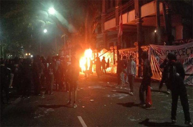 Massa berjumlah ratusan awalnya melakukan aksi damai. Namun usai Magrib, massa melakukan aksi yang lebih agresif.