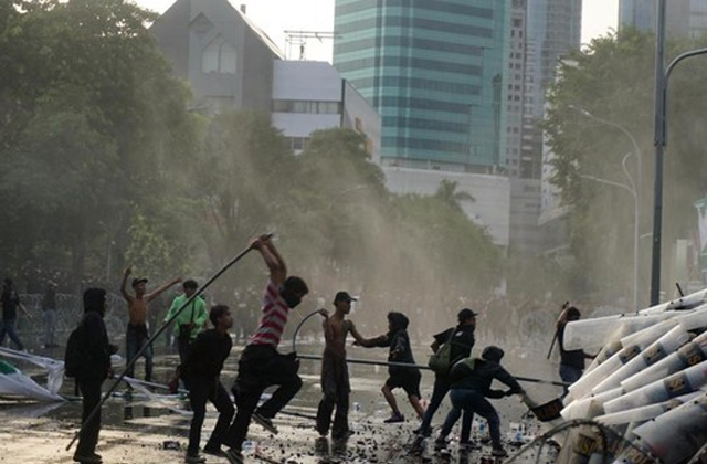 Massa yang menolak dibubarkan oleh Polisi mengamuk tak terkendali. Belasan personel Polisi pun terluka saat melakukan pengamanan.
