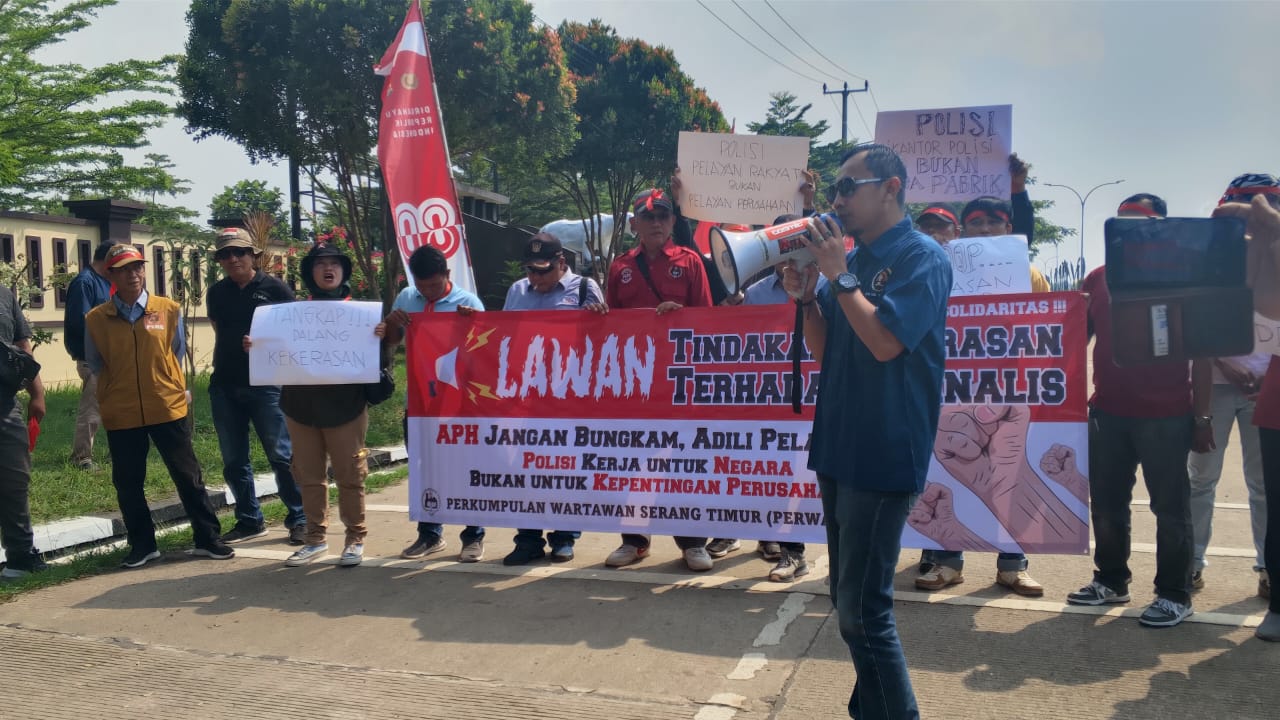 Aksi solidaritas wartawan yang tergabung dalam Perkumpulan Wartawan Serang Timur (PERWAST), POKJA AMJ, PWI Kabupaten Serang ini berlangsung di depan Mapolres Serang, Jumat, 22 Agustus 2025.