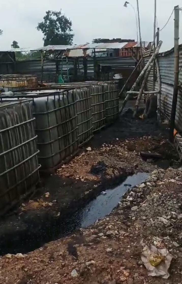 Terpantau di lokasi,satu unit truk Tanki dan puluhan boll berisi bahan berbahaya Oli Limbah B3 dan diduga ada beberapa boll berisi BBM jenis Solar.ironisnya,limbah tersebut tercecer di selokan seakan akan pengusaha tidak mengerti pencemaran lingkungan.