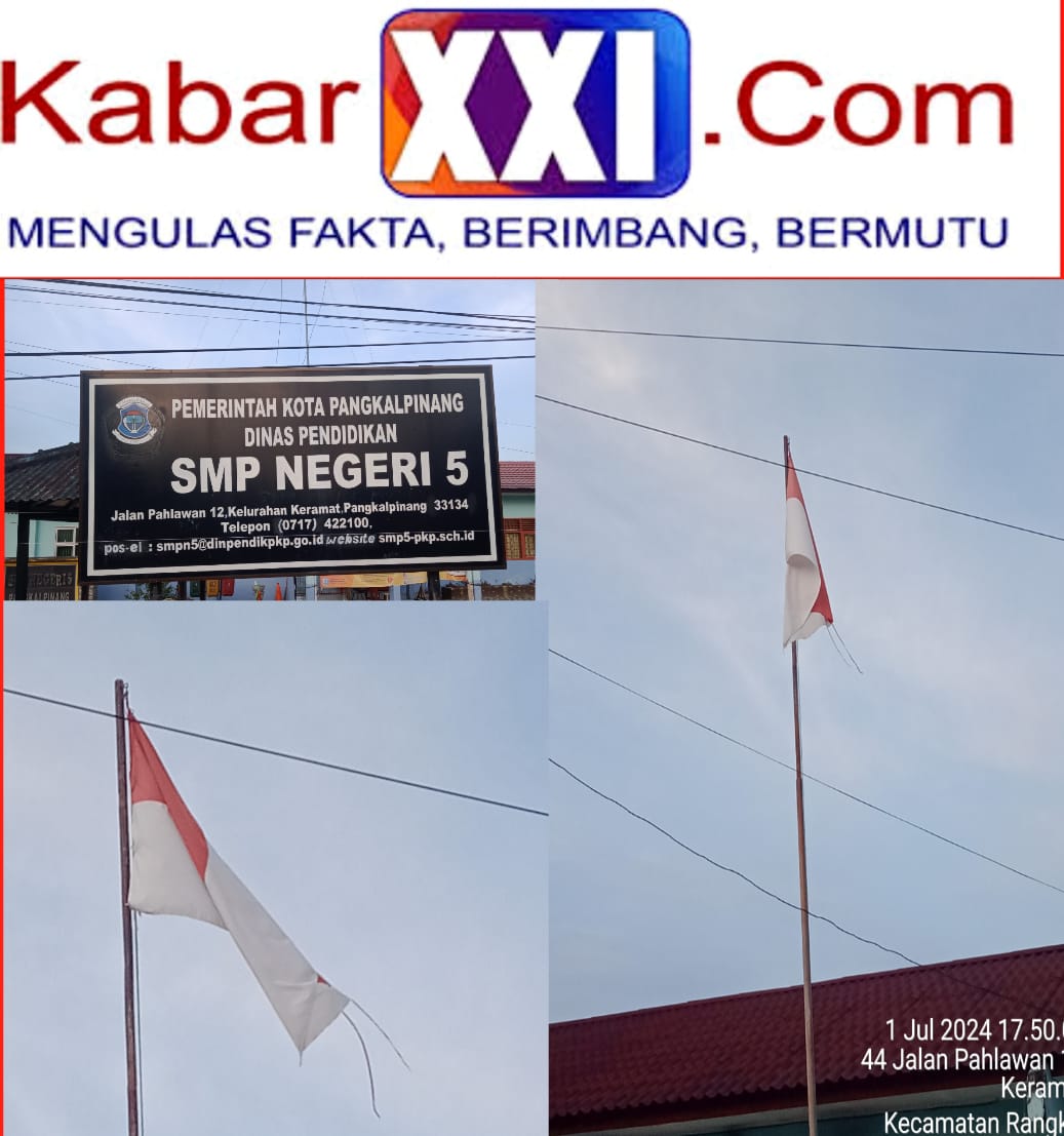 Babel, kabarxxi.com – Bendera merah putih yang merupakan lambang Negara Kesatuan Republik Indonesia (NKRI), justru dikibarkan tidak layak di halaman SMPN 5 keramat, kecamatan rangkul, kota Pangkalpinang, provinsi kepulauan Bangka Belitung. Terlihat saat awak media melintas pada Senin 1 juli 2024 pukul 17:50 wib.