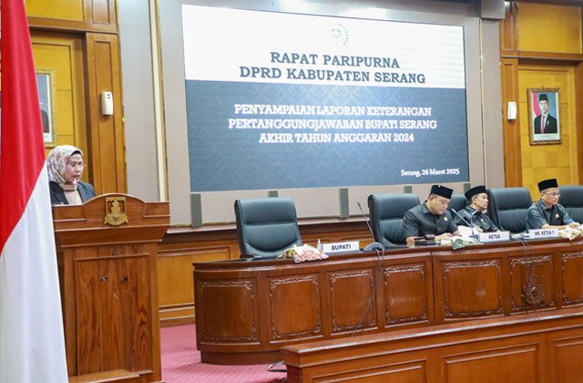 SERANG, KabarXXI.Com – Bupati Serang, Ratu Tatu Chasanah menyampaikan Laporan Keterangan Pertanggungjawaban (LKPJ) Tahun 2024 pada Rapat Paripurna DPRD Kabupaten Serang, Rabu, 26 Maret 2025.