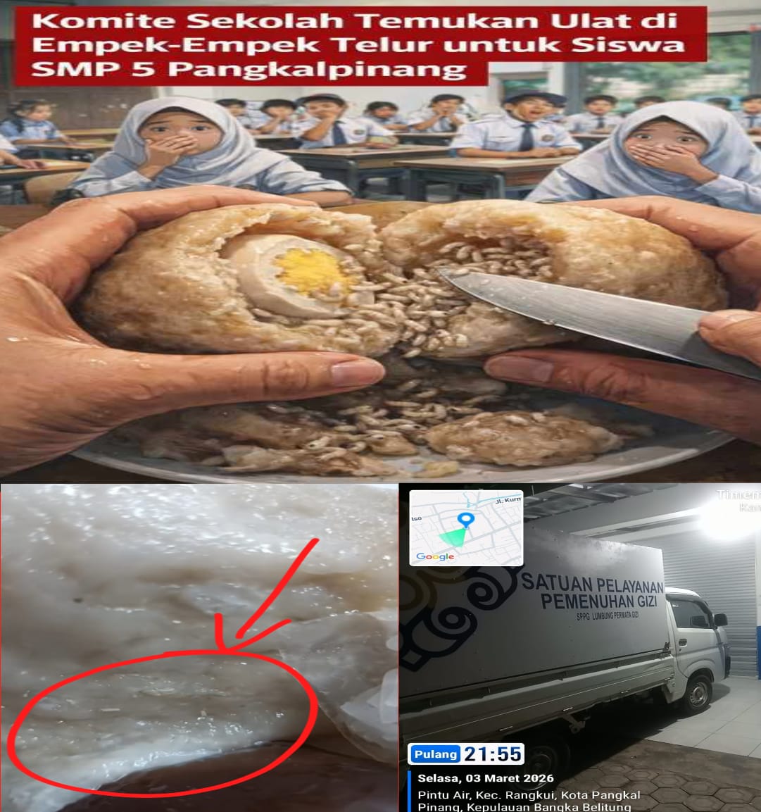 Pangkalpinang, kabarxxi.com — Program Makanan Bergizi Gratis (MBG) kembali disorot. Kali ini, temuan mencengangkan datang dari ibu-ibu komite SMP 5 Pangkalpinang. Mereka menemukan ulat pada makanan MBG berupa empek-empek telur yang hendak dibagikan kepada siswa. Temuan itu terjadi pada pasokan yang disebut berasal dari Satuan Pelayanan Pemenuhan Gizi (SPPG) Lumbung Permata Gizi, yang berlokasi di kawasan Pintu Air, Kota Pangkalpinang. Selasa (3/3/2026).