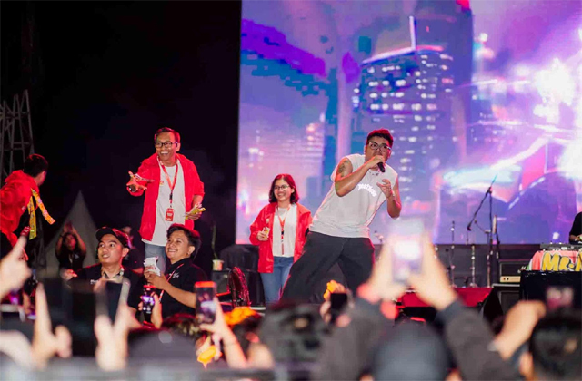 Arwin Nugraha Hutasoit, Head of Marketing PT Bintang Toedjoe (berjaket merah di depan) naik panggung membagikan hadiah bagi pengunjung konser di Anti Angin-Angin Club Fest, Kota Metro, Lampung.