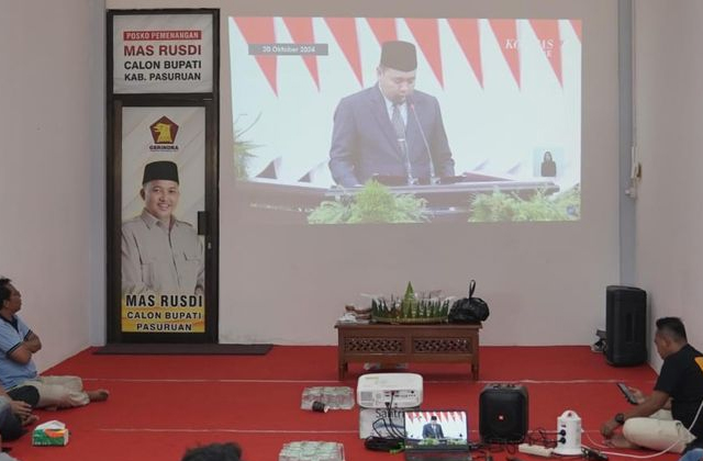 Paslon Nomor Urut 2 ini mengadakan nobar di Kantor DPC Kabupaten Pasuruan, yang terletak di Kelurahan Kalianyar, Kecamatan Bangil, bersama tim kampanye.