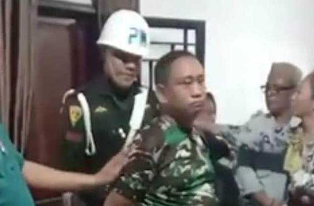 Dalam video tersebut terlihat terduga pelaku menggunakan seraagam loreng diamankan dua anggota Polisi Militer dari dalam rumah dan dibawa ke mobil.