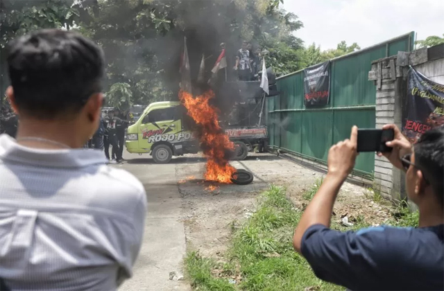 Massa yang tergabung dalam Aliansi Madura Indonesia (AMI) itu melakukan aksi bakar ban di depan pabrik sebagai bentuk kekesalan mereka lantaran pihak pabrik tidak berada di lokasi.