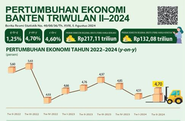 Pada Triwulan II 2024 Perekonomian Banten tumbuh 4,70 persen secara y-on-y (Triwulan II 2024 dibandingkan Triwulan II 2023). Dibandingkan terhadap triwulan I-2024, perekonomian Provinsi Banten triwulan II-2024 mengalami pertumbuhan sebesar 1,25 persen (q-to-q).