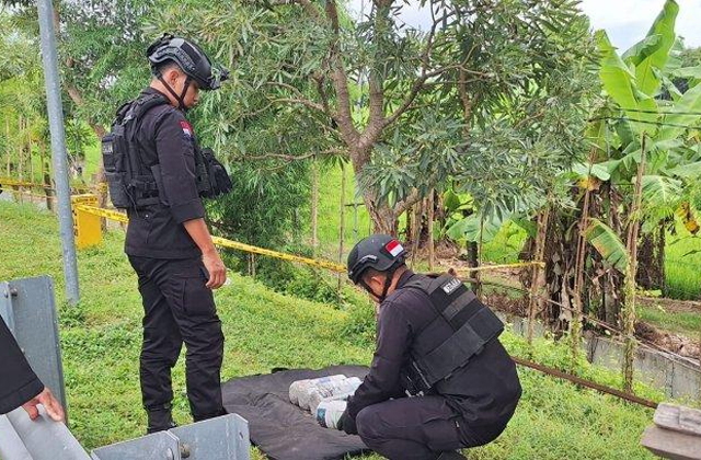 Tim Gegana Satbrimob Polda Jatim saat mengamankan paket petasan jumbo yang diduga bom yang ditemukan di depan exit tol Madiun, Kamis, 30 Januari 2025.