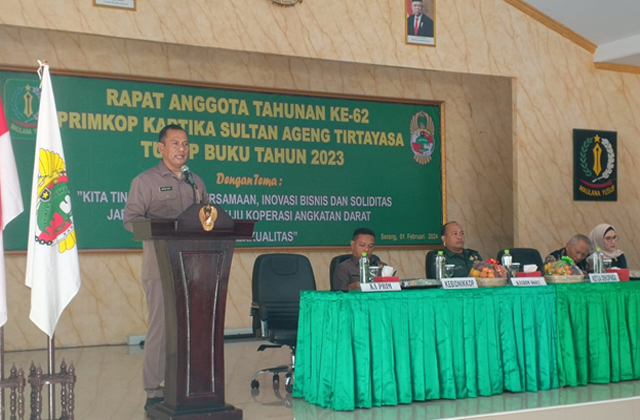 SERANG, KabarXXI – Primer Koperasi (Primkop) Kartika Sultan Ageng Tirtayasa Kodim 0602/Serang menggelar kegiatan Rapat Anggota Tahunan ke-62 Tahun 2024, dengan mengusung tema “Kita Tingkatkan Kebersamaan, Inovasi Bisnis dan Soliditas Jaringan Usaha Menuju Koperasi Angkatan Darat yang Berkualitas”, di Aula Sultan Ageng Tirtayasa Makodim 0602/Serang, Kelurahan Tembong, Kecamatan Cipocok Jaya, Kota Serang, Banten, Kamis, 01 Februari 2024.