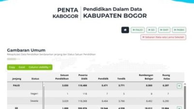 2. selaku pemangku kebijakan layanan pendidikan sesuai dengan Peraturan Bupati Nomor 129 Tahun 2021 Tentang Kedudukan, Susunan Organisasi, Tugas dan Fungsi Serta Tata Kerja Dinas Pendidikan. Dengan dasar tersebut Dinas Pendidikan Kabupaten Bogor meluncurkan program pengembangan sistem Pendidikan Dalam Data (PENTA) dengan harapan tercapainya pemetaan dan pemerataan penyebaran tenaga pendidik dan kependidikan di seluruh satuan pendidikan dengan tujuan pemaksimalan layanan pendidikan bagi masyarakat Kabupaten Bogor.