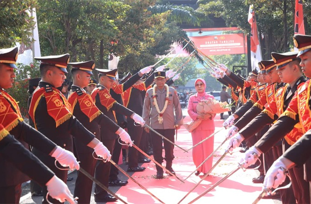 Nanang Avianto disambut oleh pejabat utama dan jajaran kapolres di halaman Mapolda Jatim pada Rabu melalui upacara serah terima Pataka Polda Jatim “Tanhana Dharma Mangrva”.