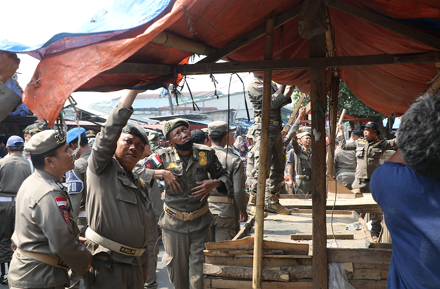 Petugas Satpol PP langsung membongkar lapak satu per satu dengan menggunakan alat manual berupa linggis, palu, pisau dan lainnya. Tidak ada perlawanan dari para pemilik lapak tersebut.
