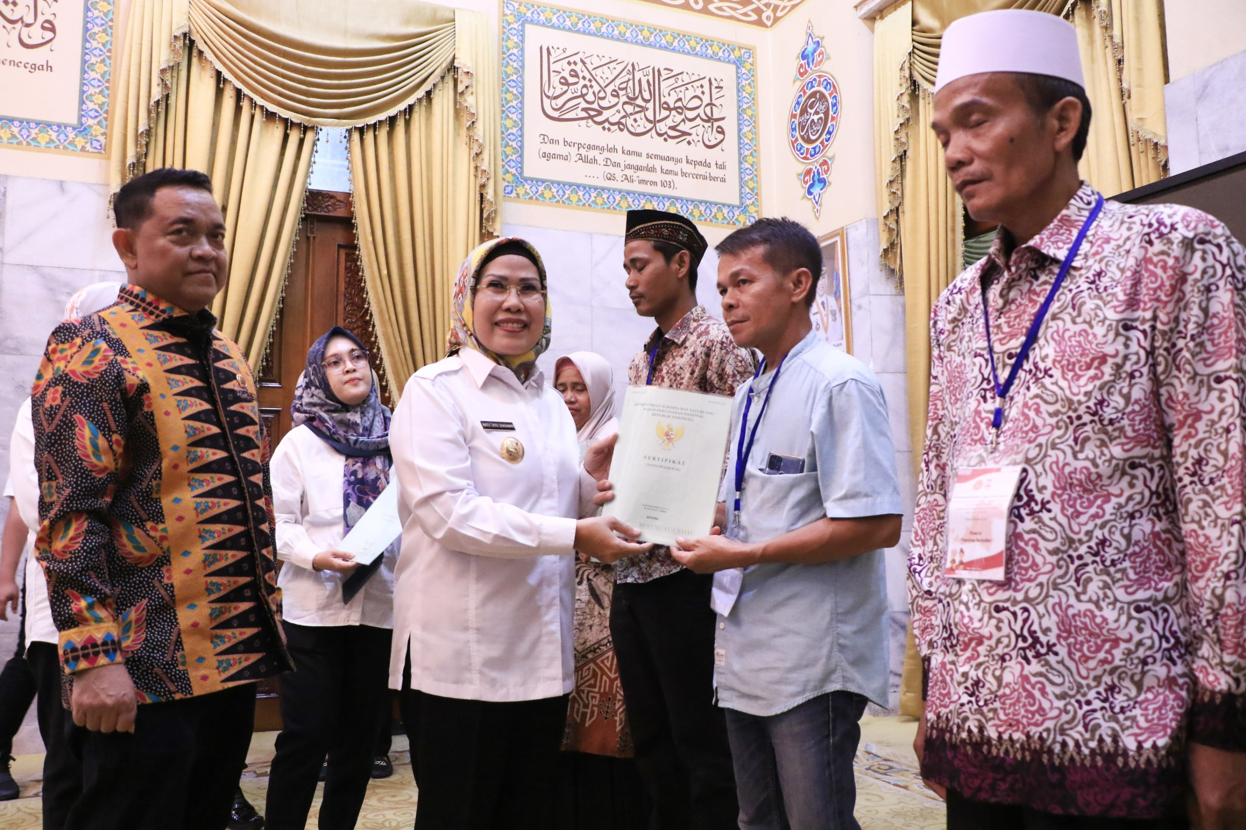 SERANG KabarXXI.Com – Bupati Serang, Ratu Tatu Chasanah secara simbolis menyerahkan sertifikat tanah Program Pendaftaran Tanah Sistematis Lengkap (PTSL) kepada masyarakat di Pendopo Bupati, Rabu, 27 Desember 2023.
