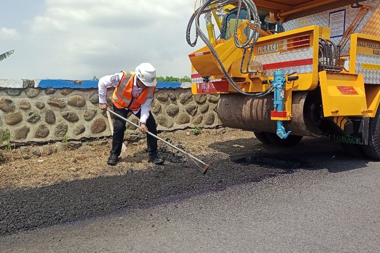 Dia terlihat menguruk material aspal untuk tambal sulam jalan. Bahkan dia menggerojok material aspal dengan linggis naik ke atas truk Alpomain.
