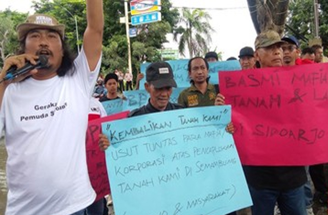 Tampak massa aksi membawa poster yang bertuliskan ‘Basmi Mafia Tanah/Laut di Sidoarjo’, ‘Kembalikan Tanah Kami’, ‘Usut Tuntas Para Mafia Korporasi Atas Pencaplokan tanah kami’.